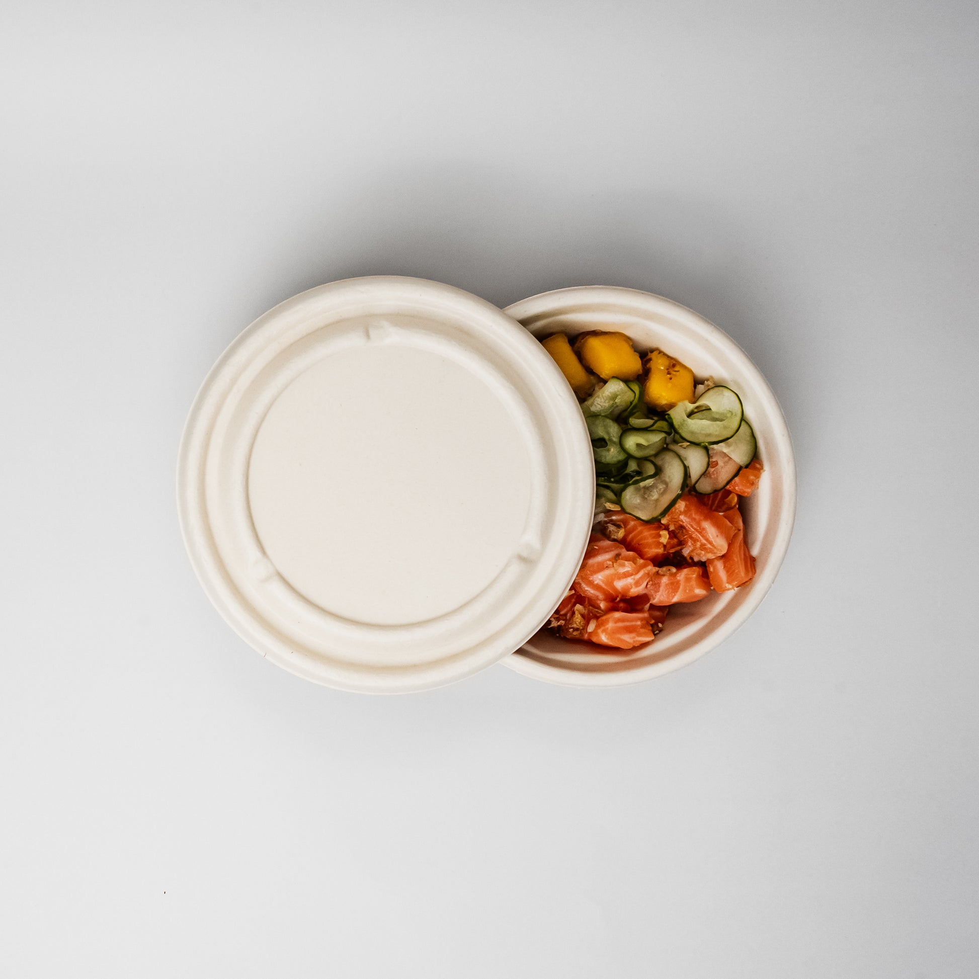Kit bowl biodegradável de 600ml com tampa. Base e tampa feitas do mesmo material. Fechamento por pressão. Ideal para todos os tipos de comida.