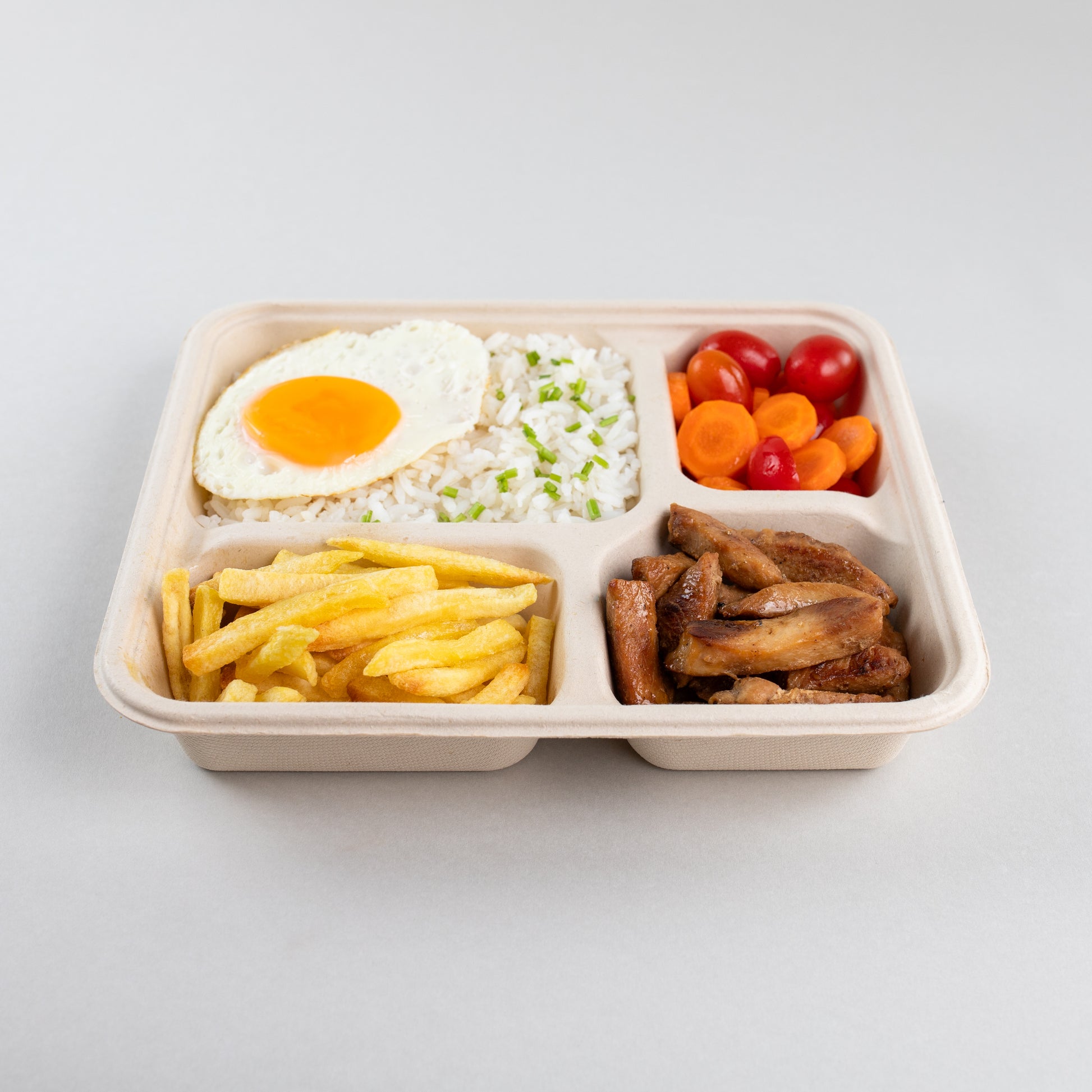 Marmita feita de fibras de plantas, 100% compostável. Perfeita para delivery de qualquer tipo de comida, fresca ou congelada. Também usada para eventos e consumo no local.